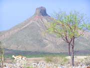 Im Nordwesten des Landes, weit weg von jeder technischen Erungenschaft, liegt das Kaokoveld, der weitaus wildeste Landesteil Namibias. Von den Namibiern wird es auch „das Raue Paradies“ genannt. Unendliche, weite Ebenen, Trockensavannen und Mopanebäume beherrschen das Landschaftsbild. Die Breiten, mit Sand gefüllten Flussbetten der Trockenflüsse finden hier noch selbst ihr Ziel. Selten sind sie mit Wasser gefüllt, nur ab und an regnet es. Die Sonne hingegen scheint unaufhörlich. Als Strassen der Allradfahrzeuge werden die Flussbetten genutzt, denn oft ist nur hier ist ein Vorankommen möglich.