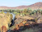 Wir verabschieden uns und weiter führt die Reise Richtung Norden. Zebras, Giraffen und Paviane begegnen uns, ganz abgesehen von den unzähligen Antilopen. Und dann unerwartet: Ein Tal tut sich vor uns auf. Der Blick fällt in die grüne Oase, des ewig wasserführenden Kunene-Flusses. Unzählig grüne, riesengroße Makalani-Palmen säumen das Ufer, Rankpflanzen klettern in den Himmel und Vogelgezwitscher tönt überall in der Luft. Rauschend stürzen die Epupa-Wasserfälle kaum 100 Meter vom Camp entfernt, fast 40 Meter in die Tiefe. Ein Regenbogen leuchtet, entstanden durch Wassergischt und Sonnenlicht. Der Anblick überwältigt. Gerade eben durchstreiften wir das trockene Land und nun sind wir angekommen an den berühmten Epupa-Wasserfällen des Kaokoveldes - im rauen Paradies Namibias.