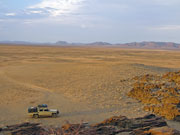 5.Tag: Auf der heutigen Fahrt zur Vingerklip Lodge, unterwegs Rundgang im versteinerten Wald, einer Ansammlung von uralten, fossilen Baumstämmen. Picknick unterwegs. Am Nachmittag Ankunft in der Lodge, im Tal der Ugab Terrassen. Die Lodge liegt direkt an einer der Terrassen. Besuch der Vingerklip, einem Überbleibsel der Terrassen - das Alter dieses Sandsteinkonglomerats wird auf 15 Millionen Jahre geschätzt.