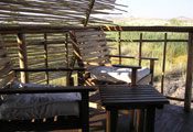 Die Lodge besitzt 20 strohgedeckte Bungalows bzw. Luxuszelte, Pool, Poolbar und ein Restaurant mit Blick auf das direkt vor der Lodge liegende Wasserloch.