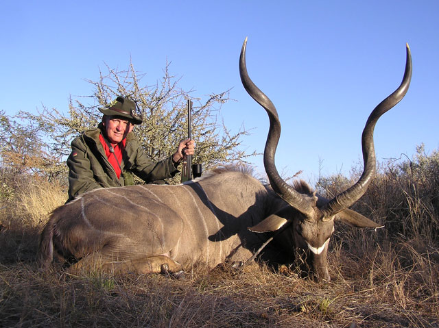 Willa Liebenberg and his Spanish client, Paco Anaya, searched for a big kudu for days. They were not too perturbed, because after all, Paco had taken a hartebeest and by then had actually given up. It was early in the morning of the fifth day and they were approaching a koppie on farm Autabib. Suddenly, from nowhere and quite unexpectedly, there were at least four big bulls in the thorn bushes. “Take him now – the big one!”