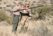 in the Kalkfeld Conservancy there are more than 25 000 ha of various cattle ranches available to hunt free ranging game. Most of these ranches were not hunted on for years. This is an interesting landscape with varying types of vegetation, e.g. thorn bush savannah, dry riverbeds, some hills and mountains as a backdrop.Accomodation: tented camp - Pictures? Click.